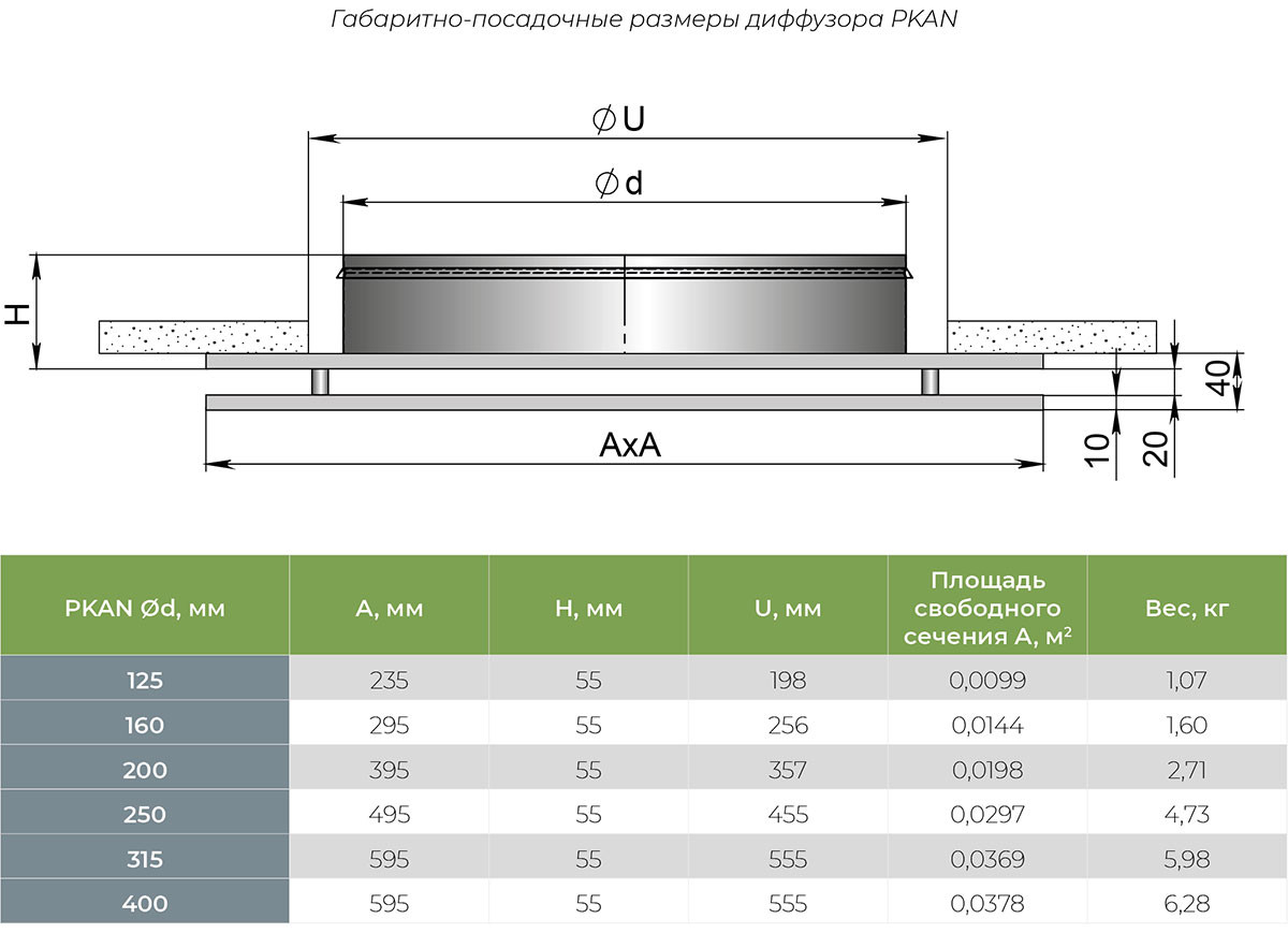 Диффузоры изготавливаются из оцинкованной листовой стали толщиной 0,9 мм и по умолчанию покрываются полимерной порошковой краской белого цвета RAL 9016M (матовая). Камера статического давления по умолчанию поставляется без покрытия. По запросу возможна окраска в любой цвет по международной шкале RAL как лицевой панели, так и камеры. Заказать камеру статического давления для диффузора PKAN.
